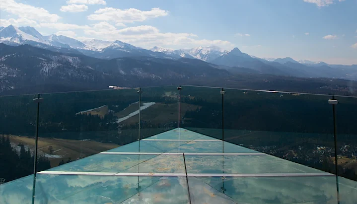 Звідси відкривається казкова панорама Татр та навколишніх селищ, яку взимку складно передати словами. Родзинка вежі – найбільша скляна тераса в Польщі, розташована на висоті 1122 м н.р.м.